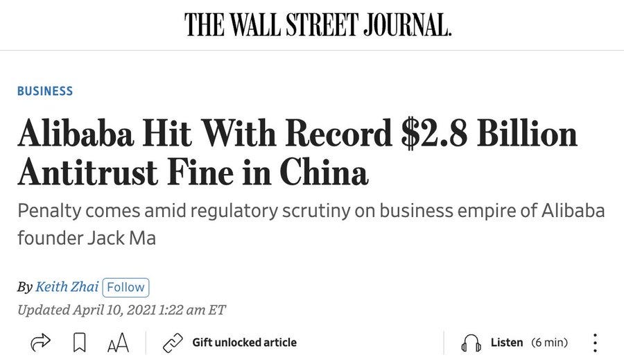 Chính phủ Trung Quốc kết luận rằng Alibaba đã "lạm dụng vị thế thống lĩnh thị trường" kể từ năm 2015 bằng cách ngăn cản người bán sử dụng các nền tảng thương mại điện tử khác Alibaba.