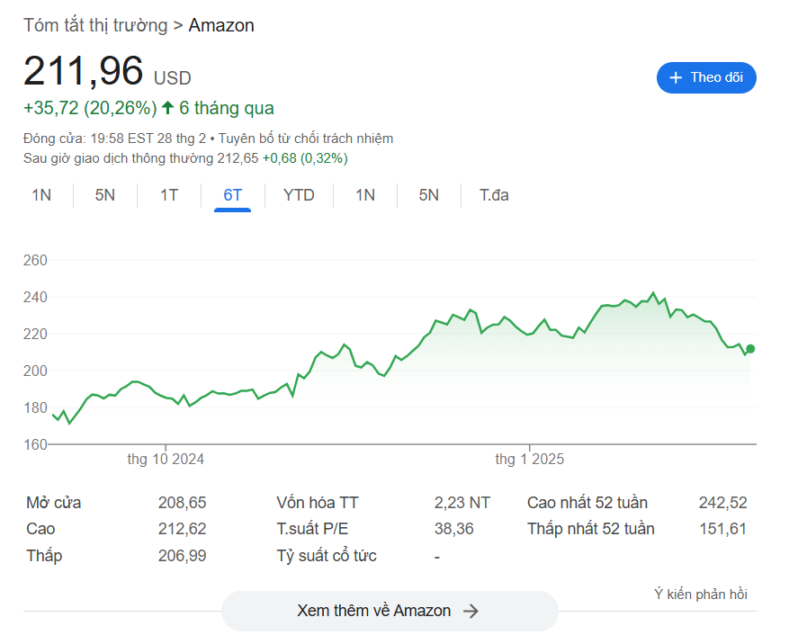 Cách đây 5 tháng, khi Viet Hustler phân tích về Amazon, cổ phiếu $AMZN đang ở mức $161. Giờ đây, $AMZN đã tăng lên $212, đem lại lợi nhuận 31.7% chỉ trong 7 tháng! Những con số ấn tượng này phản ánh sự tăng trưởng mạnh mẽ với doanh thu $638 tỷ và lợi nhuận $60 tỷ trong năm 2024, gần như gấp đôi so với năm trước
