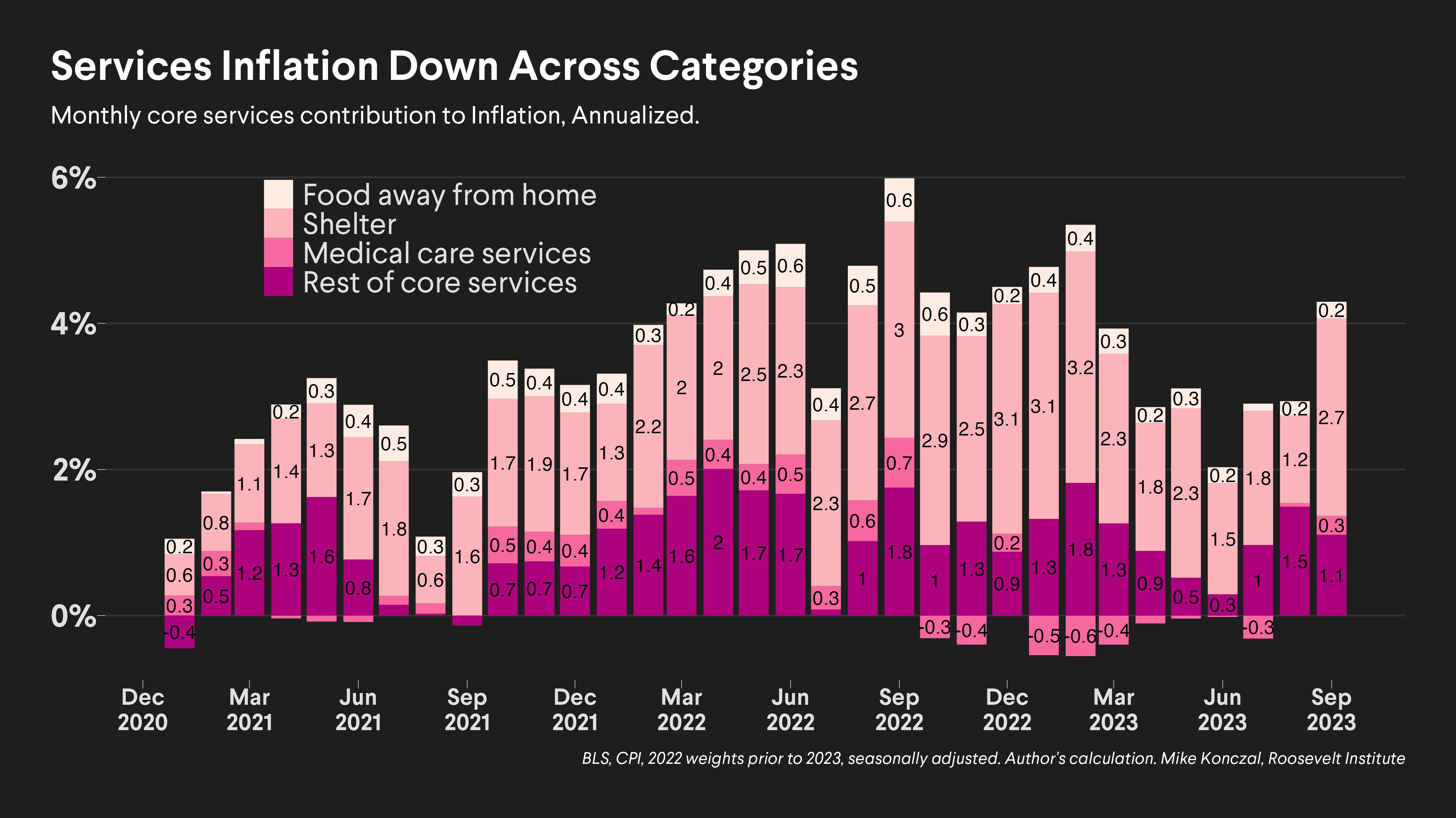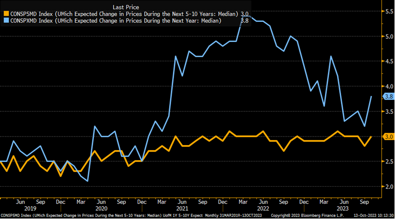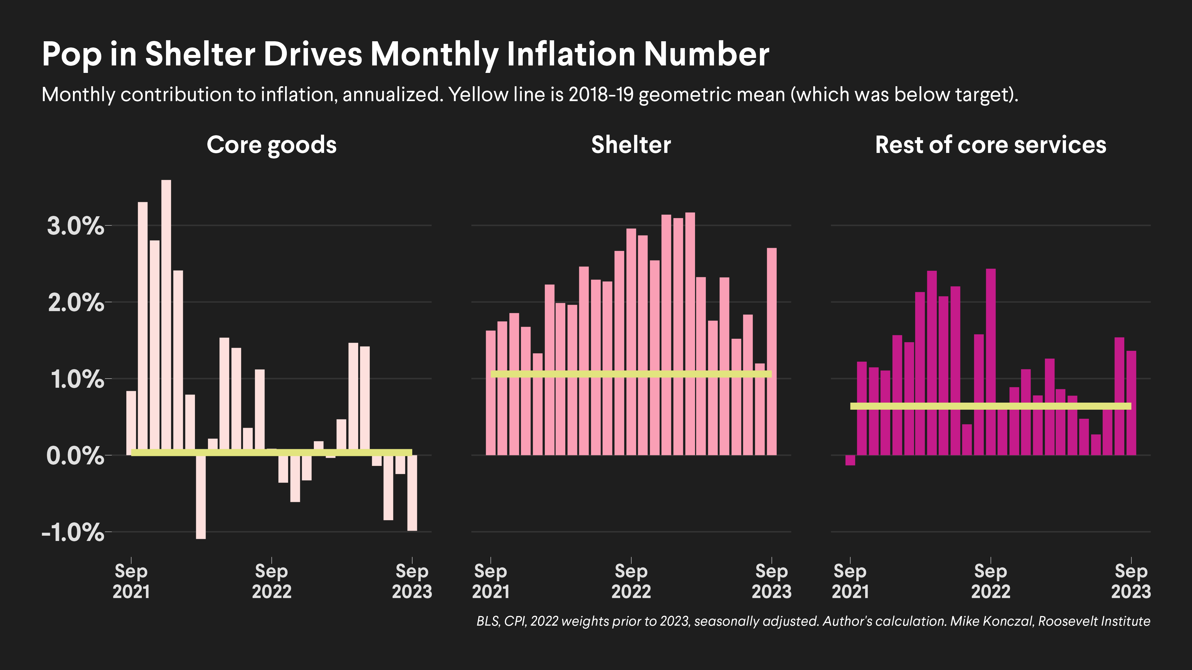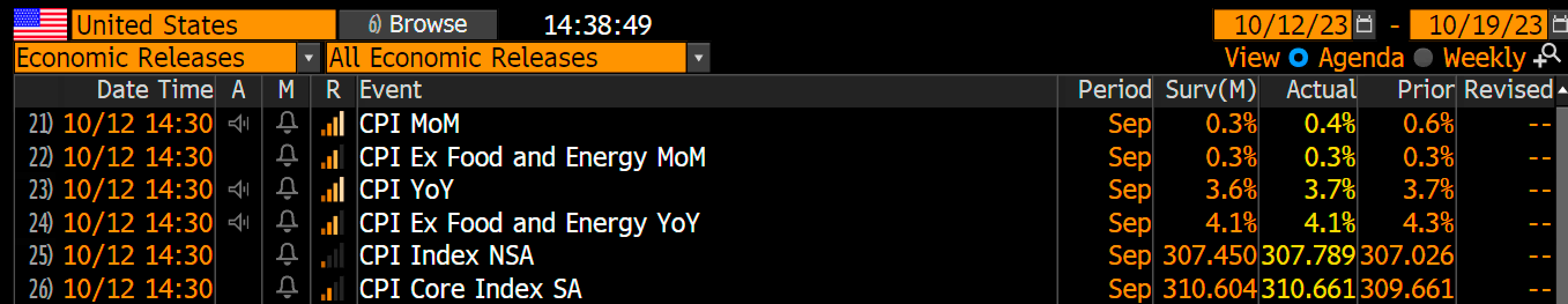 Lạm phát tổng hợp của tháng 09/2023 tại Mỹ đã tăng cao (so với dự đoán) ở mức +3.8%, chủ yếu do ảnh hưởng của giá năng lượng tăng trở lại. Đối với con số tăng trưởng CPI cốt lõi, chủ yếu ảnh hưởng của giá nhà ở cao vẫn là nguyên nhân chủ chốt, dù cho giá cả dịch vụ siêu cốt lõi vẫn đang tăng trở lại, đặc biệt là chi phí y tế.