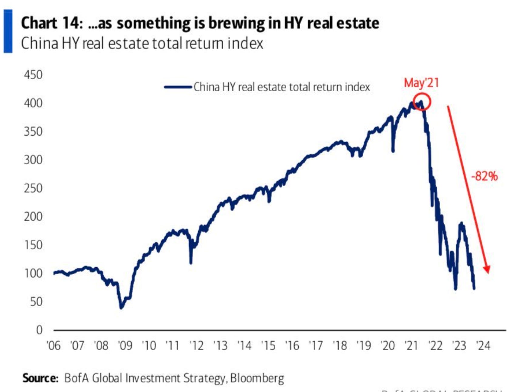 Chỉ số tổng hợp trái phiếu bất động sản của các công ty trẻ (high-yield) của Trung Quốc đã giảm -82% so với mức đỉnh trước đó.