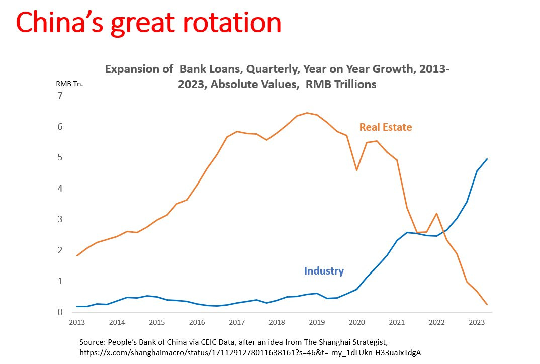 Dấu hiệu rõ ràng nhất về ý định của chính phủ Trung Quốc về chính sách kinh tế là sự xoay chuyển trong việc phân bổ tín dụng từ BĐS sang sản xuất công nghiệp: