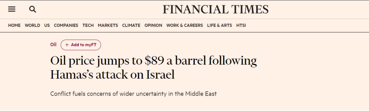 Nguy cơ giá dầu tăng cao do chiến tranh Israel-Hasam. Tuy nhiên, hiện tại Mỹ đang càng ngày càng tự chủ về dầu thô và năng lượng.