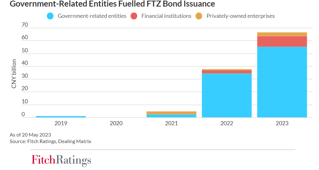 Trong khi, Fitch ước tính LGFV (một dạng trái phiếu chính quyền địa phương) đã chiếm đến 75% lượng Trái phiếu Khu vực thương mại tự do (FTZ bonds) kể từ cuối năm 2022.