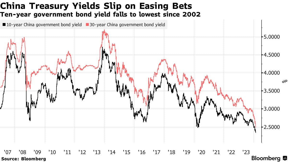 Cho dù PBOC đã thực sự cắt giảm lãi suất + thả lỏng tiền tệ (QE) và đưa ra hàng loạt các gói kích thích kinh tế, khiến lợi tức trên thị trường giảm sâu: