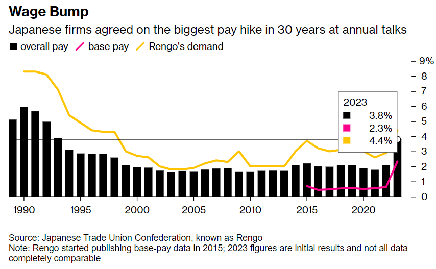 Năm ngoái, Liên Đoàn Lao Động tại Nhật đã thành công đàm phán mức tăng lương cao nhất trong vòng 30 năm trở lại đây (dù vẫn chỉ ở mức ~ +3.8% y/y).