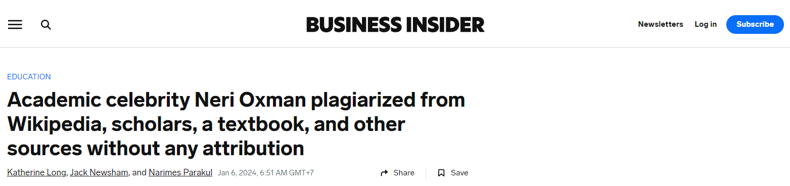 Trong khi bài đăng của Neri trên X chỉ thừa nhận bốn trích đoạn thiếu dấu ngoặc kép và 1 câu bị trích thiếu nguồn, Business Insider lại lên bài rằng: “Neri Oxman thừa nhận đã đạo văn trong luận án tiến sĩ của mình sau Báo cáo của Business Insider”
