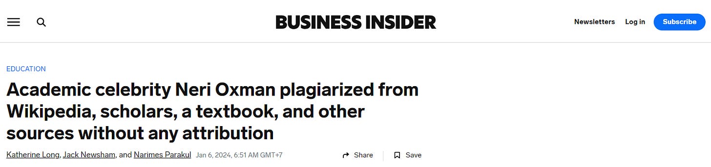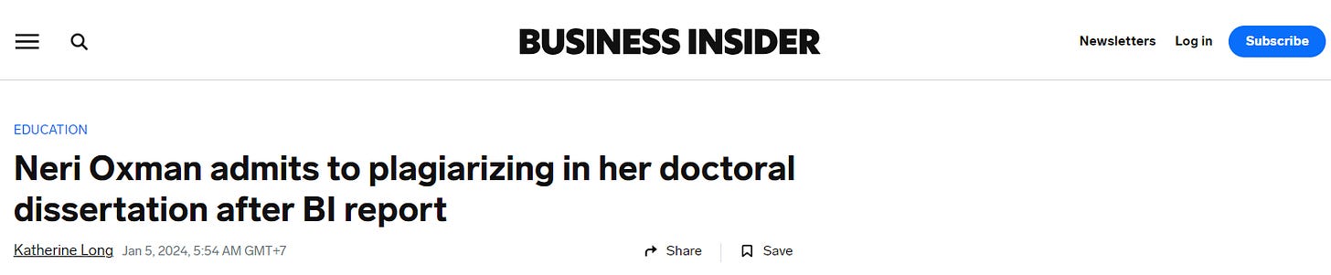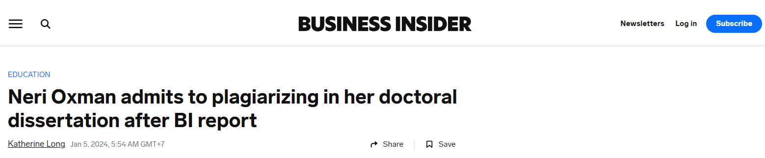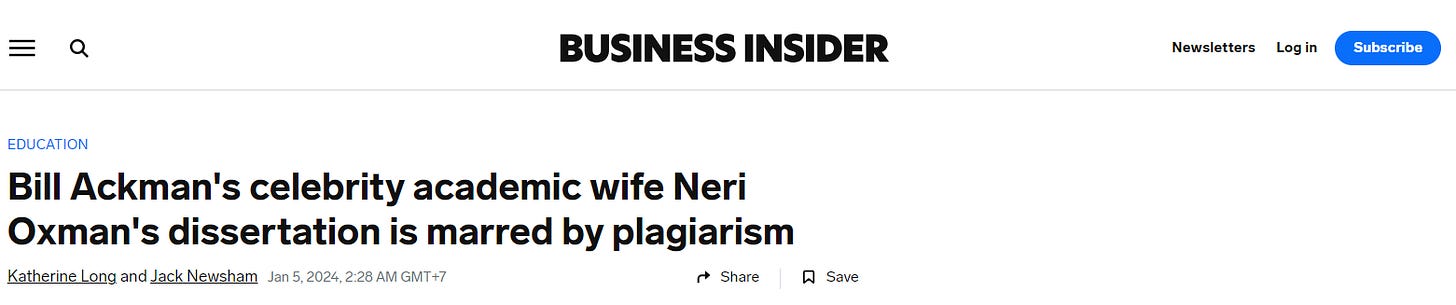 Ngày 01/05 vừa qua, vợ Bill Ackman - bà Neri Oxman - bị Business Insider lên bài cáo buộc có hành vi đạo văn giống hệt cựu Hiệu trưởng Harvard Claudine Gay - người vừa phải từ chức vì loạt bê bối vạ miệng và đạo văn.