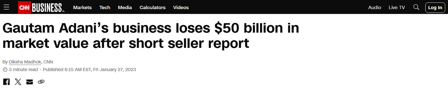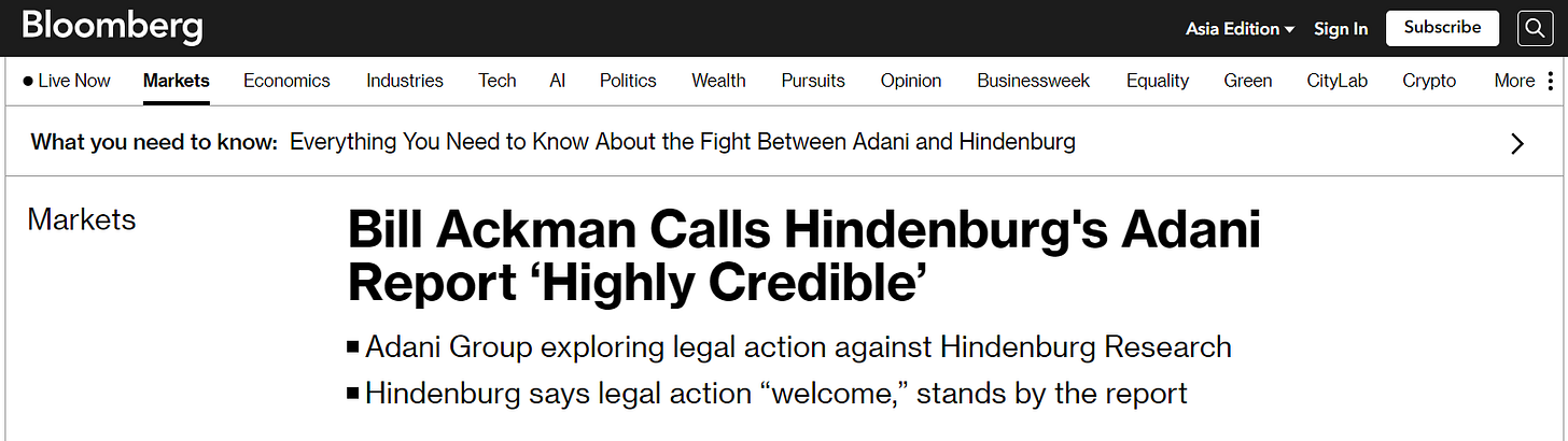 Khi Hindenburg Research đưa ra báo cáo nhận định giá trị của Adani Group — một trong những công ty lớn nhất Ấn Độ của tỷ phú Gautam Adani, đã bị phóng đại lên rất nhiều lần thông qua việc thao túng thị trường và gian lận sổ sách, Bill Ackman đã chia sẻ trên X rằng chi tiết của bản báo cáo là “rất đáng tin cậy và được nghiên cứu kỹ lưỡng”.
