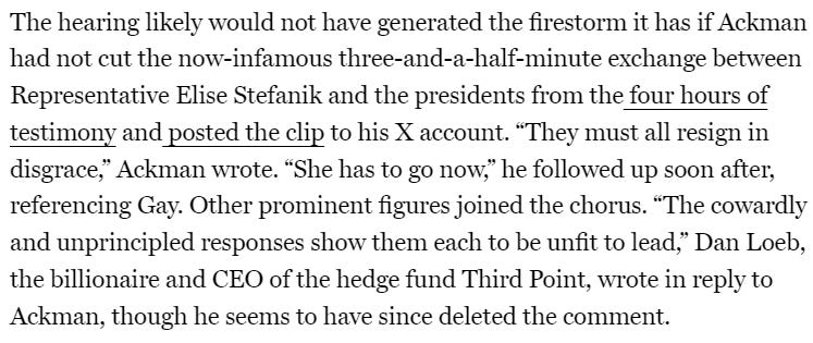 Phát ngôn này của tỷ phú Bill Ackman như cú tự vả đau đớn dành cho chính ông vì chỉ vài ngày trước, ông đưa ra bình luận gay gắt về bê bối đạo văn của cựu Hiệu trưởng Đại học Harvard - bà Claudine Gay.