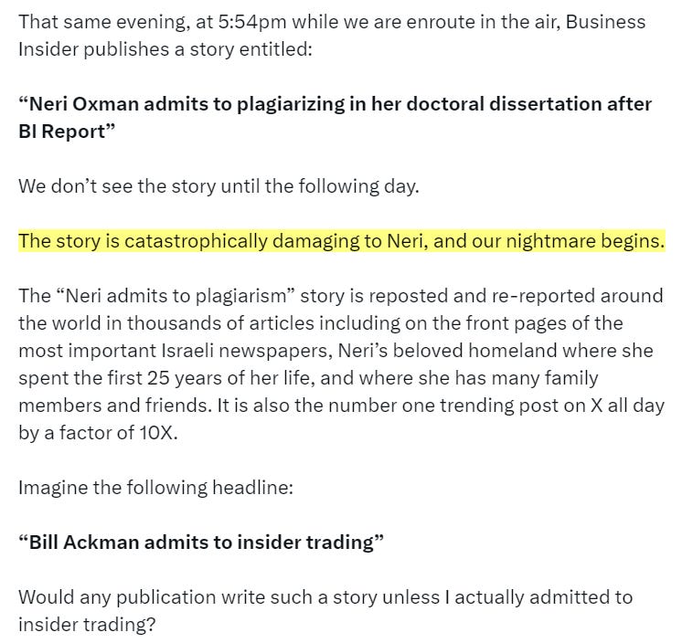 Trong bài đăng trên X, Bill Ackman đã nói rằng việc này đã gây tổn hại nặng nề cho Neri, khi câu chuyện “Neri thừa nhận đạo văn” được đăng đi đăng lại trên khắp thế giới….