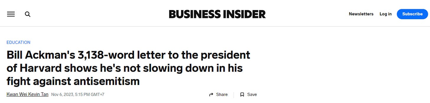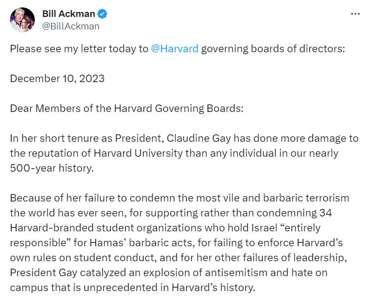 Ngày 2023/10/7: khi xung đột giữa Hamas và Israel nổ ra, ông Ackman - với tư cách là cựu sinh viên Harvard và là người Do Thái - đã viết một bức thư dài 3,138 từ cho bà Claudine Gay - khi đó đang là Hiệu trưởng Harvard - để kêu gọi bà kỷ luật và đình chỉ học những sinh viên tham gia các hoạt động bài Do Thái trong khuôn viên trường.