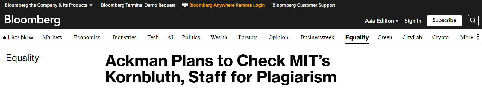 Sau cáo buộc đạo văn nhằm vào vợ mình từ Business Insider, Bill Ackman quay ra đòi kiểm tra đạo văn đối với công trình nghiên cứu của tất cả các giảng viên hiện tại của MIT, kể cả chủ tịch Kornbluth và các thành viên hội đồng MIT.