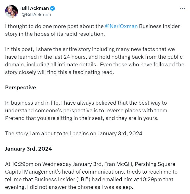 Trong tâm thư dài hơn 5,000 chữ trên X, Bill Ackman đã cáo buộc Business Insider cố ý đưa tin sai về phát biểu của vợ mình, bà Neri Oxman.