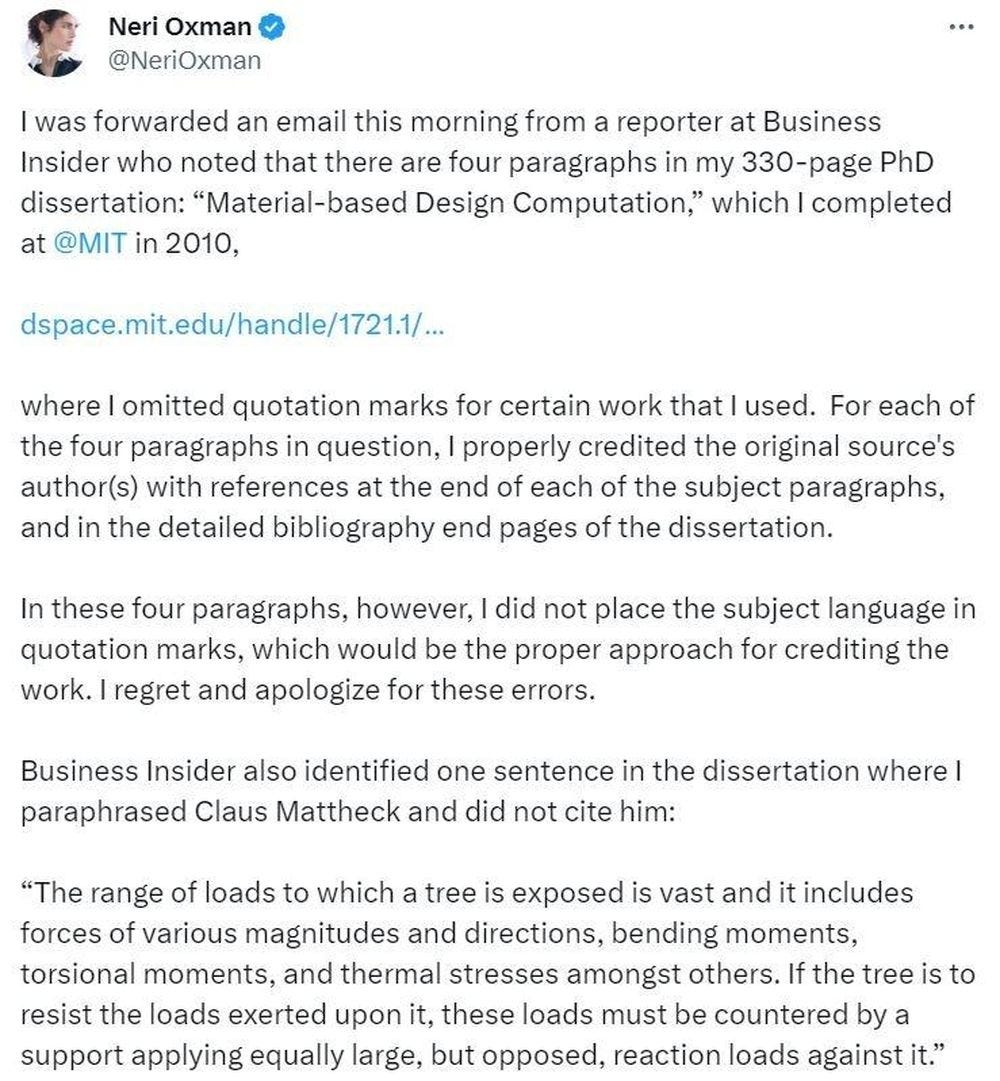 "Với mỗi đoạn trong số 4 đoạn được đề cập, tôi đã ghi nguồn chính xác các tác giả và tài liệu tham khảo ở mỗi cuối đoạn và trong các trang phụ lục ở cuối luận án. Tuy nhiên, tôi không đặt các đoạn vào dấu ngoặc kép. Việc đặt đoạn văn vào ngoặc kép là cách thích hợp để ghi nhận tác phẩm, tôi rất tiếc và xin lỗi vì những sai sót này", bà Oxman viết trên X.