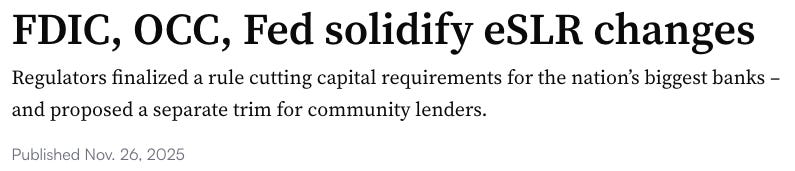 Bước ngoặt là ngày 11/25/2025. Trong bối cảnh Trump nhiệm kỳ hai đẩy mạnh deregulation, nợ công “supersized” đòi hỏi thêm bể chứa, repo market nhiều lần sặc nước vào cuối quý, ba cơ quan Fed – FDIC – OCC đã cùng ký một final rule nới SLR/eSLR. Trên giấy tờ, đây chỉ là một tinh chỉnh kỹ thuật: giảm nhẹ yêu cầu vốn ở cấp tập đoàn, đặt trần eSLR ở cấp ngân hàng con, căn chỉnh lại TLAC/LTD. Nhưng nếu nhìn từ góc độ macro, đó là một quyết định chạm thẳng vào câu hỏi: