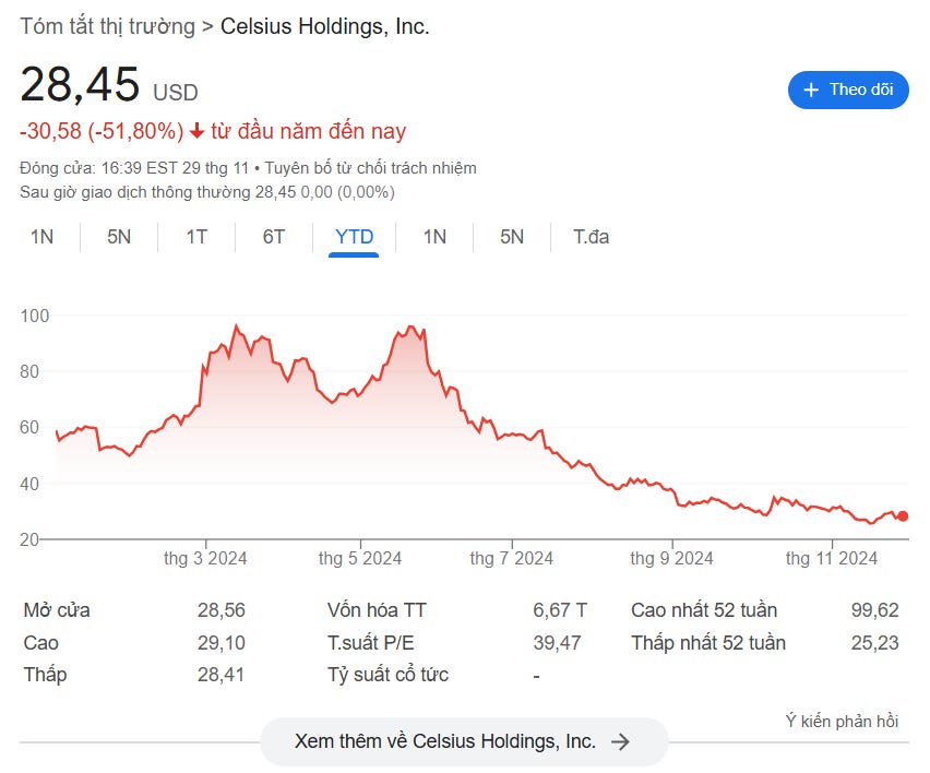 Thị trường chứng khoán Mỹ đã tăng trưởng vượt trội từ đầu năm tới nay, nhưng không phải cổ phiếu nào cũng theo kịp làn sóng này. Trong khi các gã khổng lồ như NVIDIA và Palantir nóng lên nhờ cơn sốt AI, cổ phiếu Celsius Holdings (CELH) lại có một hành trình hoàn toàn trái ngược. Sau khi đạt đỉnh vào tháng 5/2024, cổ phiếu này đã rớt giá tới 70%.