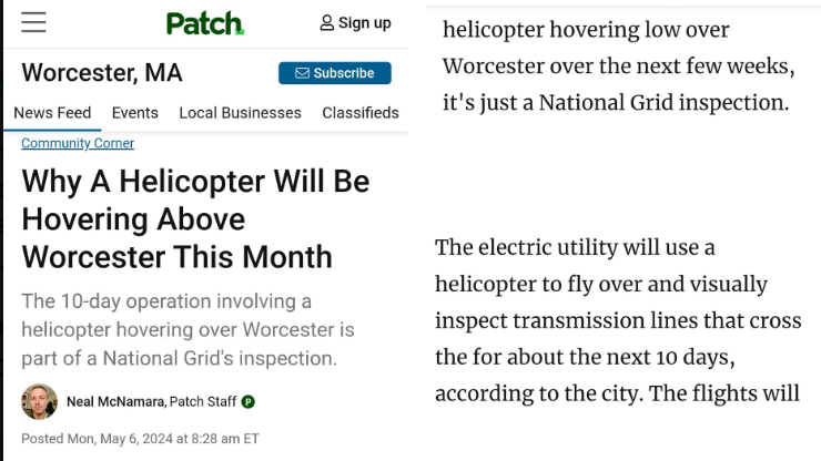 Tại trung tâm Massachusetts, Mỹ cũng đang tiến hành sử dụng trực thăng để kiểm tra lại Lưới điện Quốc gia (National Grid):