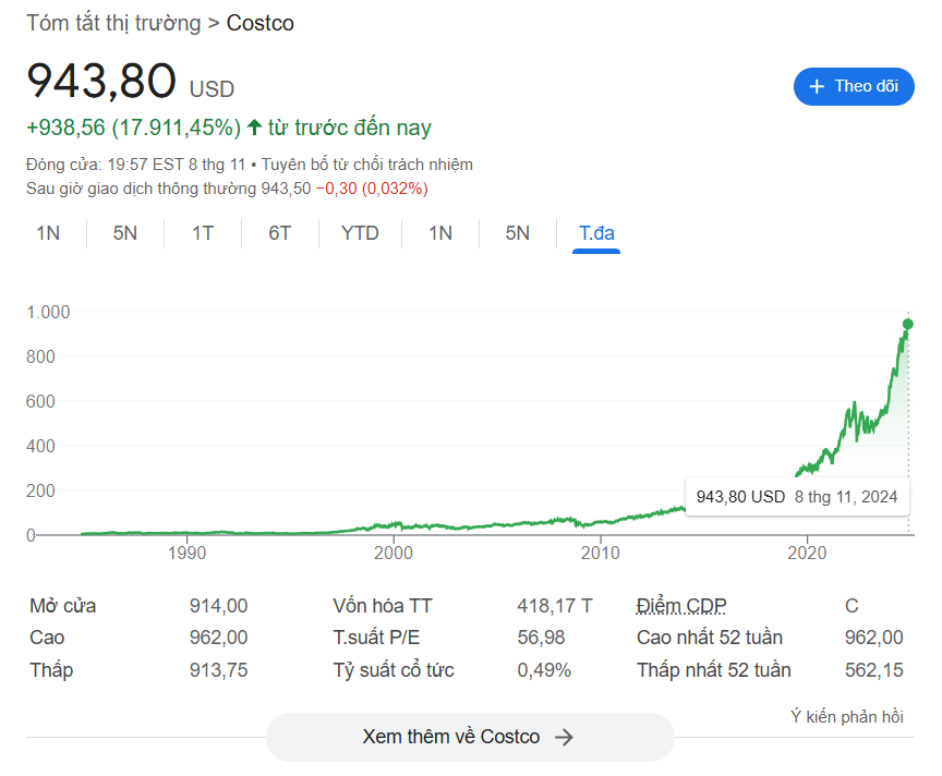Trong 20 năm qua, cổ phiếu Costco đã tăng hơn 250 lần.