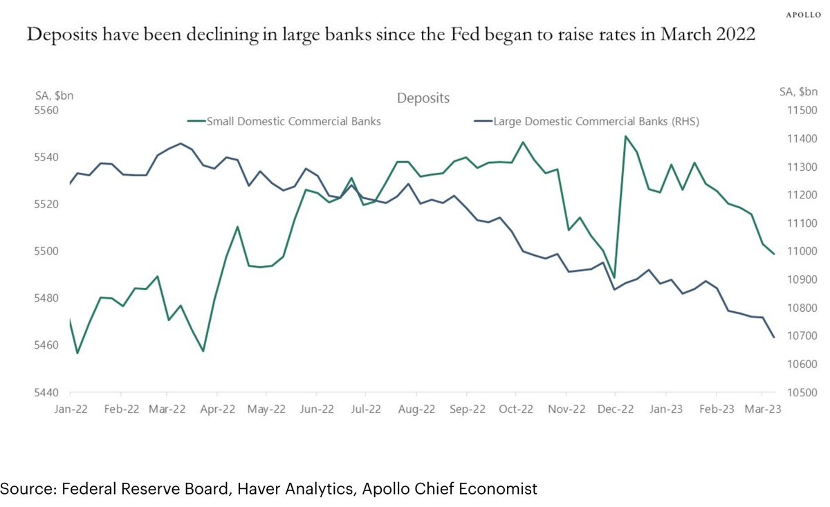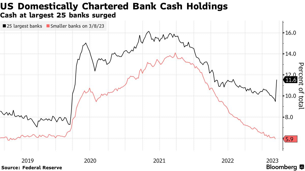 Banking crisis vẫn đang tiếp tục diễn ra trong khối các ngân hàng nhỏ sau sự kiện SVB. Những khoản cho vay cứu cánh của Fed đang là công cụ duy nhất duy trì thanh khoản của các ngân hàng này. Trong khi đó, các ngân hàng lớn đã được hưởng lợi phần nào từ chương trình vay ưu đãi của Fed và khách hàng cũ của các ngân hàng nhỏ vào tuần trước. Tuy nhiên tuần này, bank run đã bắt đầu lan sang khối ngân hàng lớn, do ảnh hưởng thay thế (substitution effect) khi depositors chuyển sang cất trữ tiền mặt trên thị trường tiền tệ (money market) với lợi tức cao hơn.