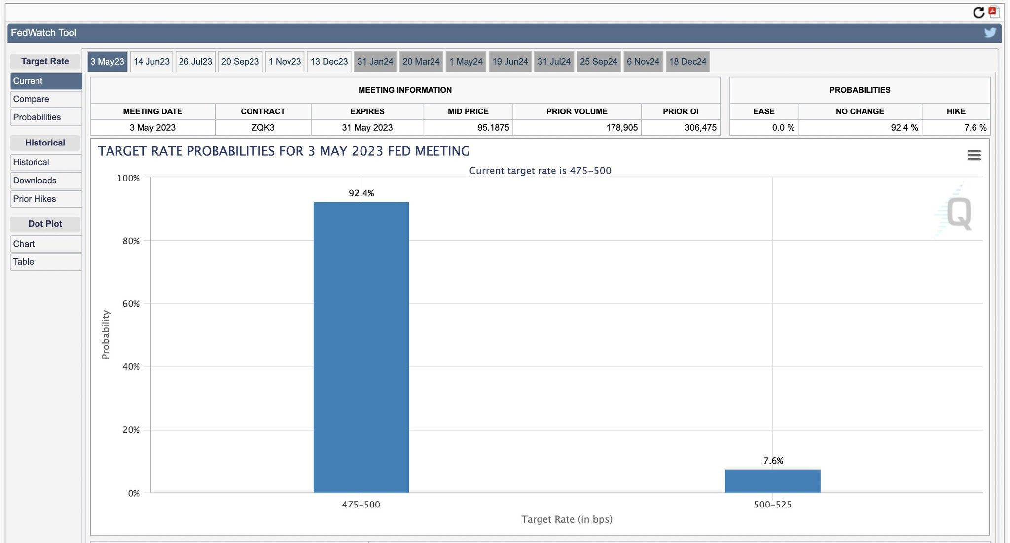 Bất chấp bài phát biểu khá hawkish của Powell tuần qua, thị trường vẫn đặt cược 92.4% rằng lãi suất Fed đã đạt đỉnh, (Fed sẽ không tăng lãi suất vào tháng 5).