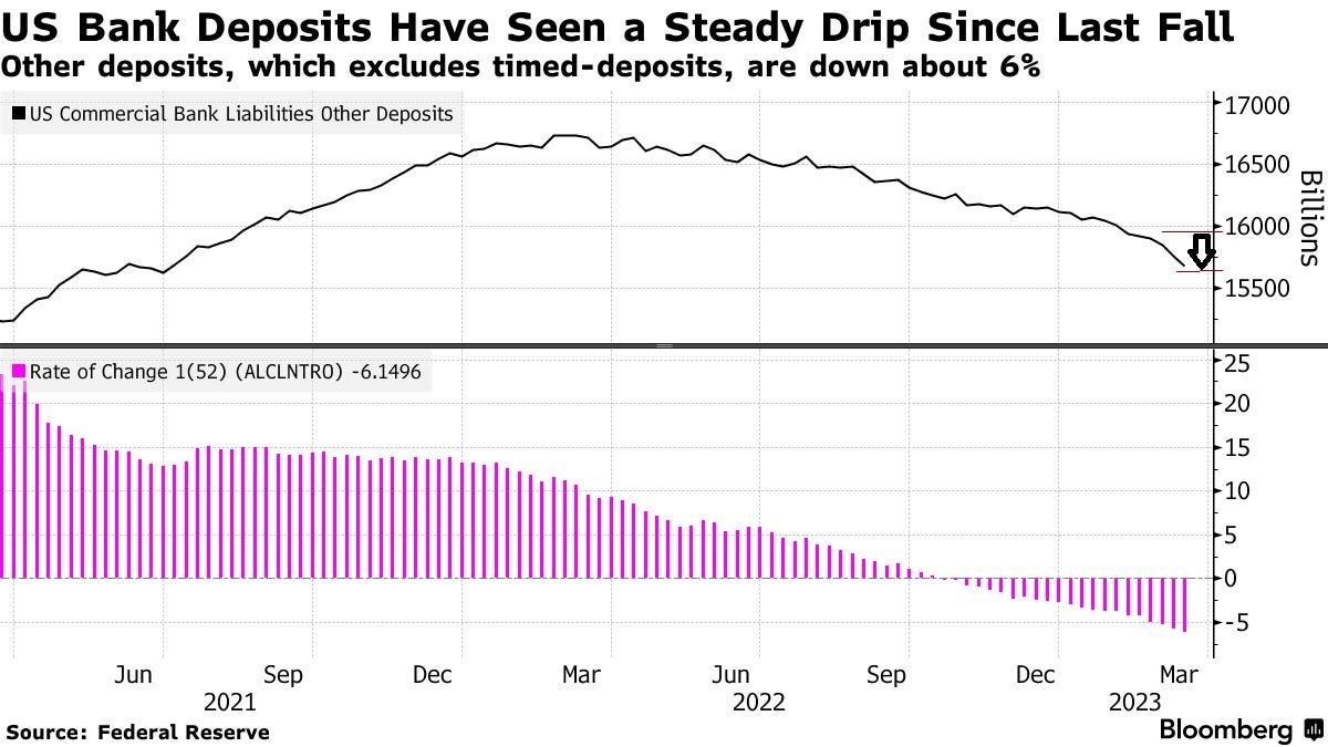 Số tiền deposit tại các ngân hàng Mỹ tiếp tục giảm. Đặc biệt, lượng tiền gửi trong các banks đã giảm tới gần -500 tỷ USD trong vòng 2 tuần sau sự sụp đổ của SVB.