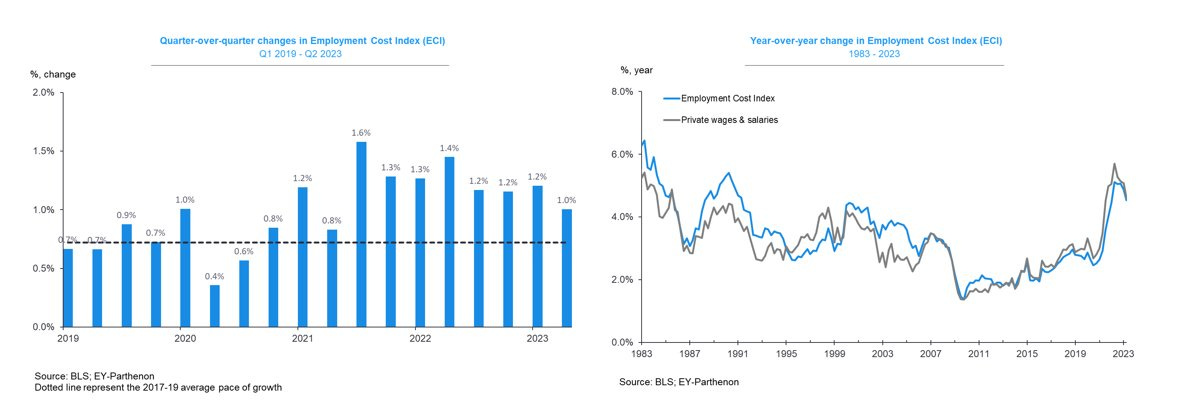 ECI đã chậm lại trong quý II/2023: +1.0% q/q (giảm so với quý I/2023: +1.2% q/q), +4.8% y/y cho thấy áp lực từ lương (thu nhập) lên lạm phát đã dịu bớt.
