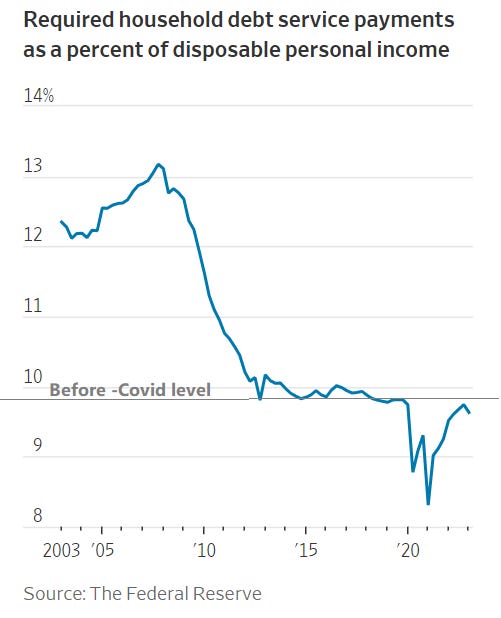 Bất chấp việc lãi suất từ Fed tăng +525bps trong vòng hơn 1 năm qua, chi phí trả nợ (% thu nhập) của các hộ gia đình vẫn thấp hơn mức trước Covid-19.