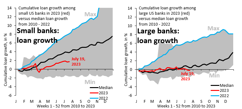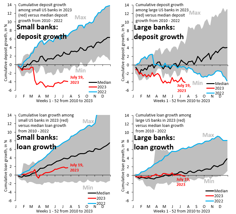 Các ngân hàng lớn hầu như đã siết chặt việc cho vay: con số tăng trưởng các khoản vay cộng dồn giao động xung quanh mức 0% (biểu đồ góc dưới bên phải).