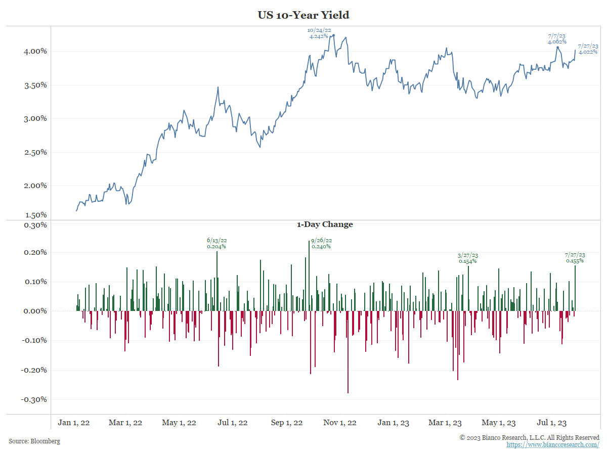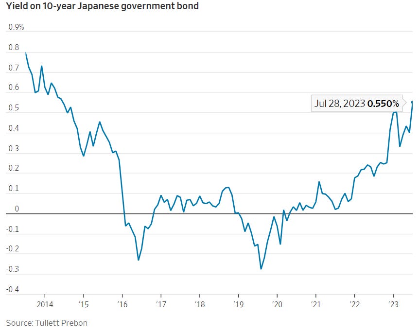 Bên cạnh đó, việc duy trì lãi suất cao trong thời gian dài không phải là áp lực duy nhất đặt lên lợi tức trái phiếu kho bạc Mỹ đang ngày một gia tăng. Chính sách mở rộng phạm vi điều chỉnh của đường cong lợi tức (YCC) từ ngân hàng Trung Ương Nhật Bản (BOJ) cũng đang tác động đến thị trường trái phiếu Mỹ.