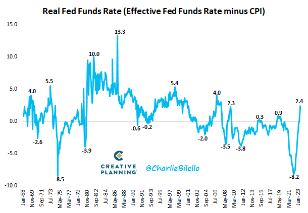 Hiện tại, Fed Funds Rate đang cao hơn lạm phát +2.4%. Lần cuối chính sách lãi suất thắt chặt như vậy là từ hồi tháng 8/2007.