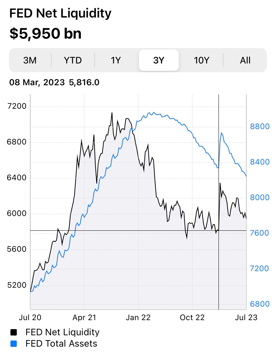 Một giả thiết nữa là, QT từ Fed hiện tại chưa thực sự triệt để do Fed vẫn bơm tiền vào các ngân hàng nhỏ qua các chương trình cho vay đối phó với banking crisis (BFPT và Discount Window).