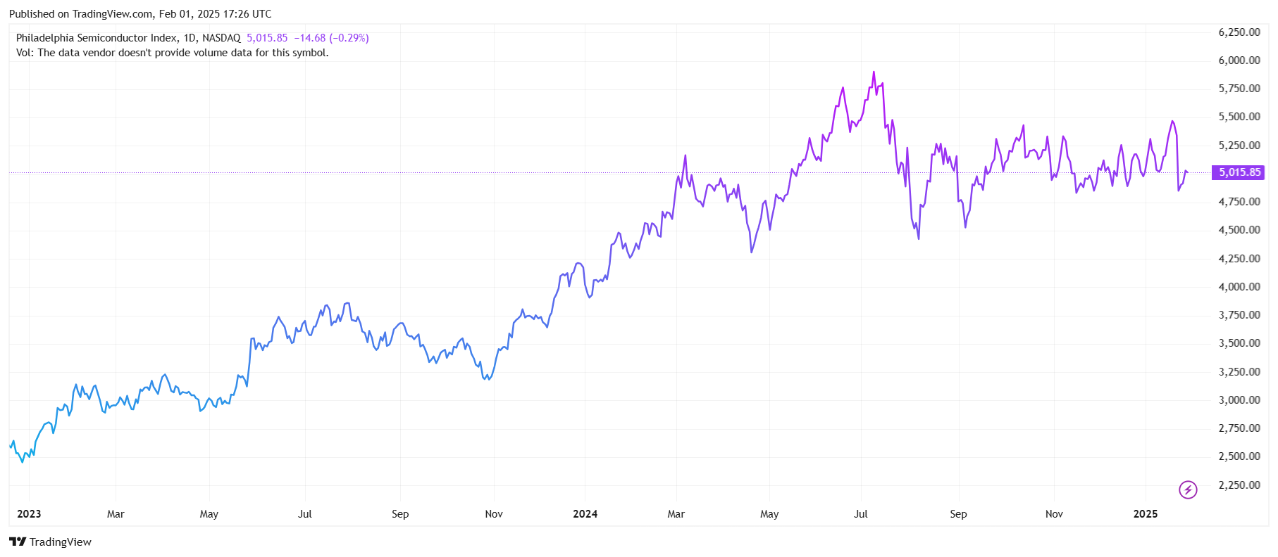 Mặt khác, chỉ số PHLX Semiconductor Sector, theo dõi hiệu suất của 30 công ty bán dẫn lớn nhất tại Mỹ đã có mức tăng ấn tượng hơn 100% kể từ đầu năm 2023.