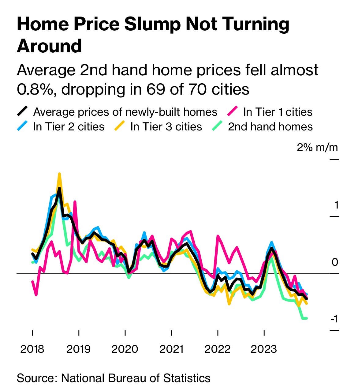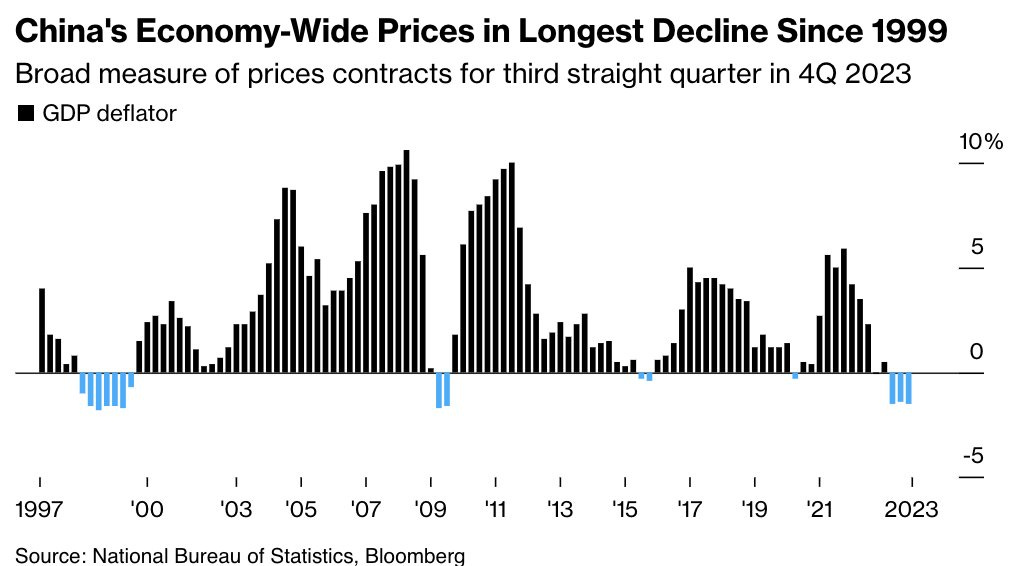 Thực tế, hệ số điều chỉnh giảm GDP (GDP deflator - để tính GDP thực tế) của Trung Quốc giảm -1.5% trong Q4/2023 - quý giảm thứ 3 liên tiếp và là mức giảm dài nhất kể từ năm 1999