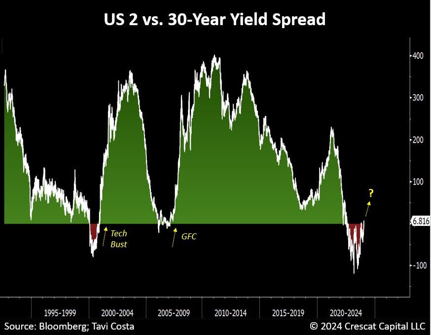 Chênh lệch lợi suất giữa trái phiếu chính phủ kỳ hạn 2 và 30 năm vừa chuyển sang mức >0