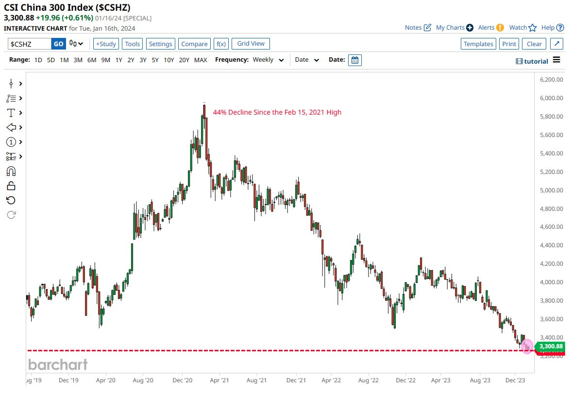 Chỉ số chứng khoán CSI giảm xuống mức đáy mới trong 5 năm là 3260.44 và hiện đã giảm hơn 44% kể từ mức cao nhất vào ngày 02/15/2021
