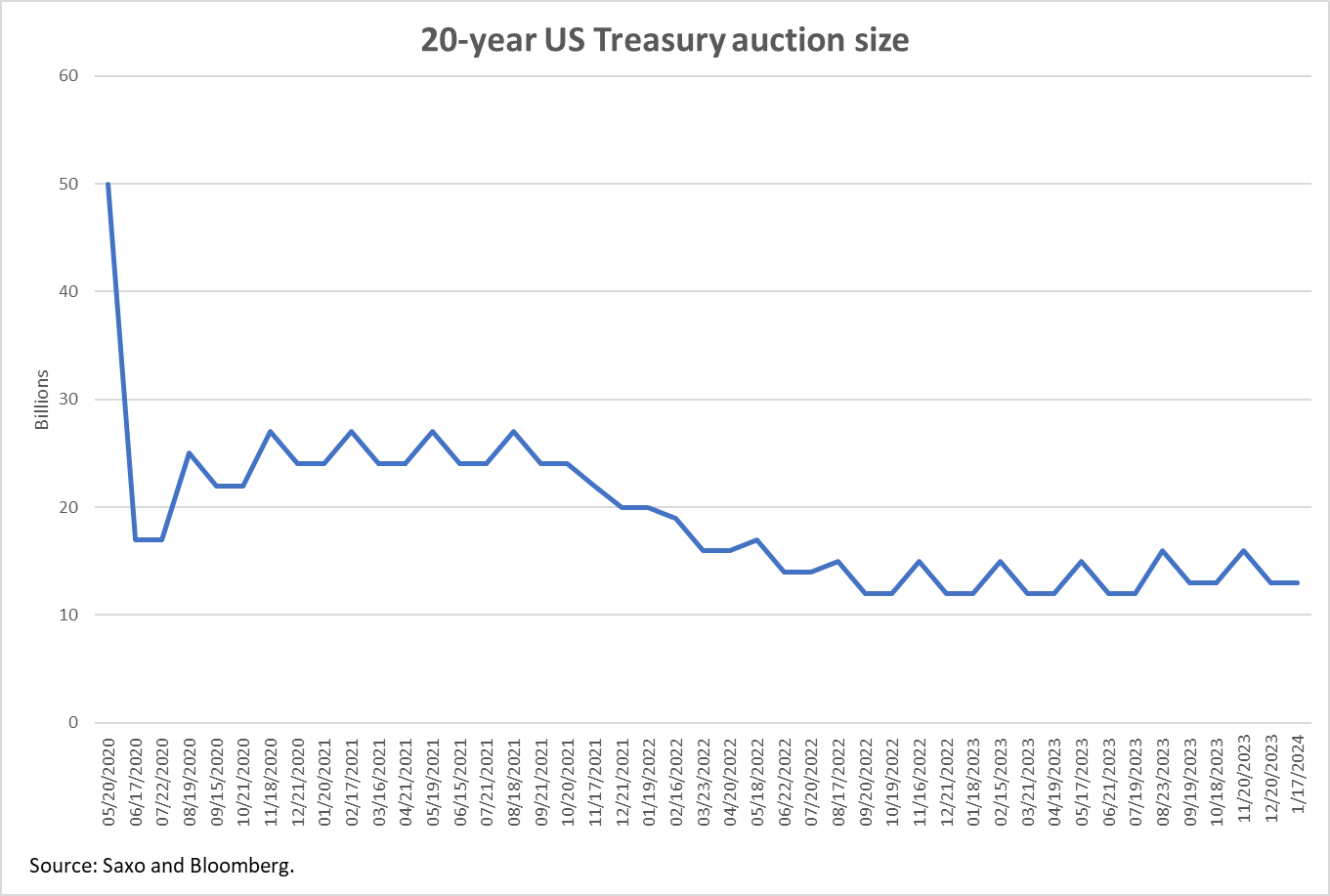 Trong đó, giá trị các phiên đấu giá T-bond 20Y ngày một giảm, một phần do Chính phủ không muốn khóa các khoản nợ dài hạn ở lãi suất cao: