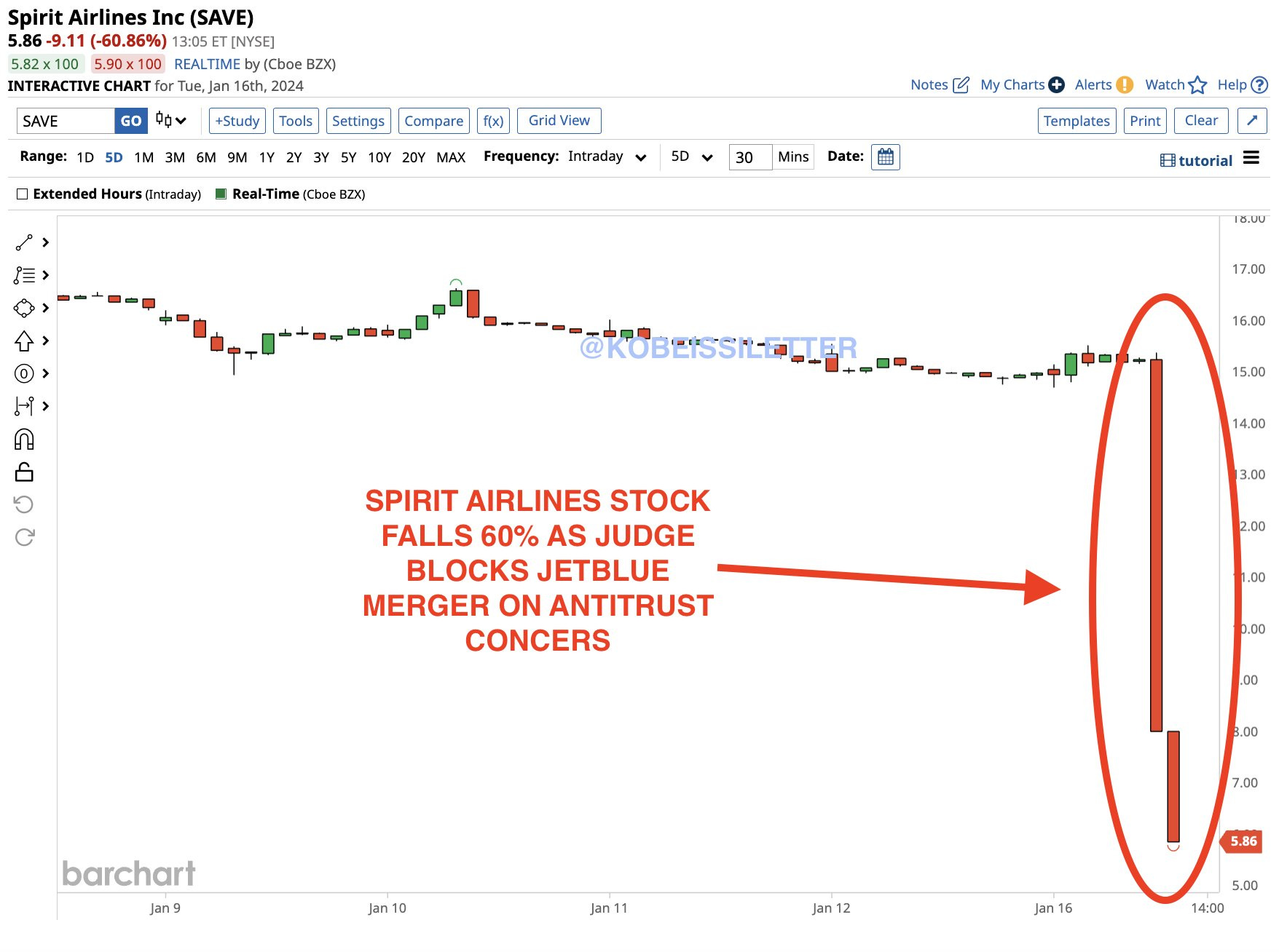 Cổ phiếu Spirit Airlines, $SAVE , giảm 60% sau khi thương vụ sáp nhập với Jetblue bị cấm do lo ngại chống độc quyền