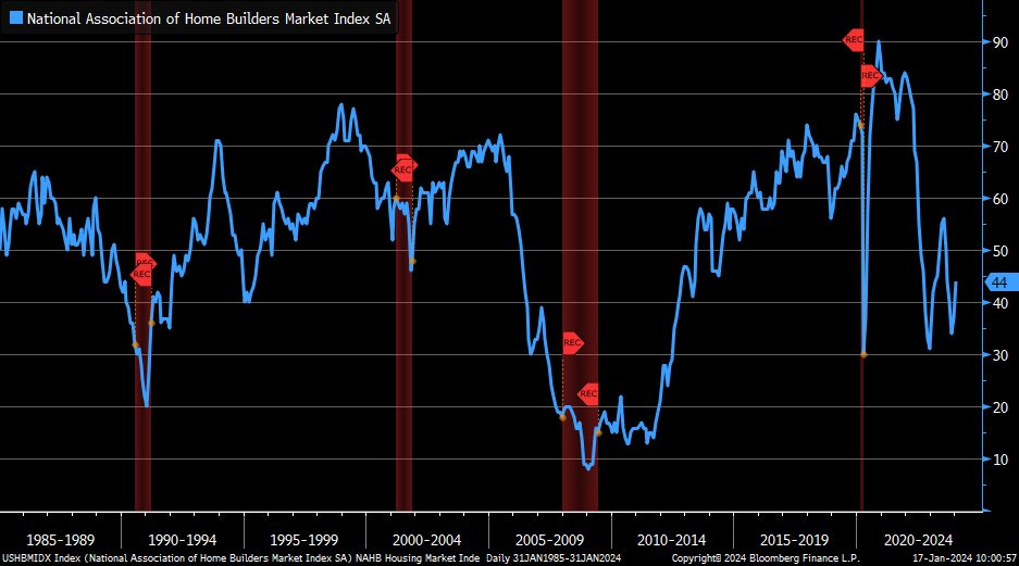 Chỉ số thị trường nhà ở NAHB tháng 1 tăng lên 44, cao hơn mức dự kiến 39 và cao hơn mức 37 của tháng trước
