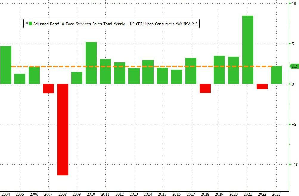 Doanh số bán lẻ “thực” năm 2023 - điều chỉnh theo lạm phát, tăng +2.2% Y/Y - tốt hơn nhiều so với mức âm vào năm 2022 dù là mức tăng yếu nhất kể từ 2018