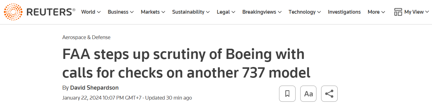Đề xuất mới được đưa ra sau sự cố vận hành gần đây của dòng máy bay 737 MAX 9 do tập đoàn Boeing (Mỹ) sản xuất.