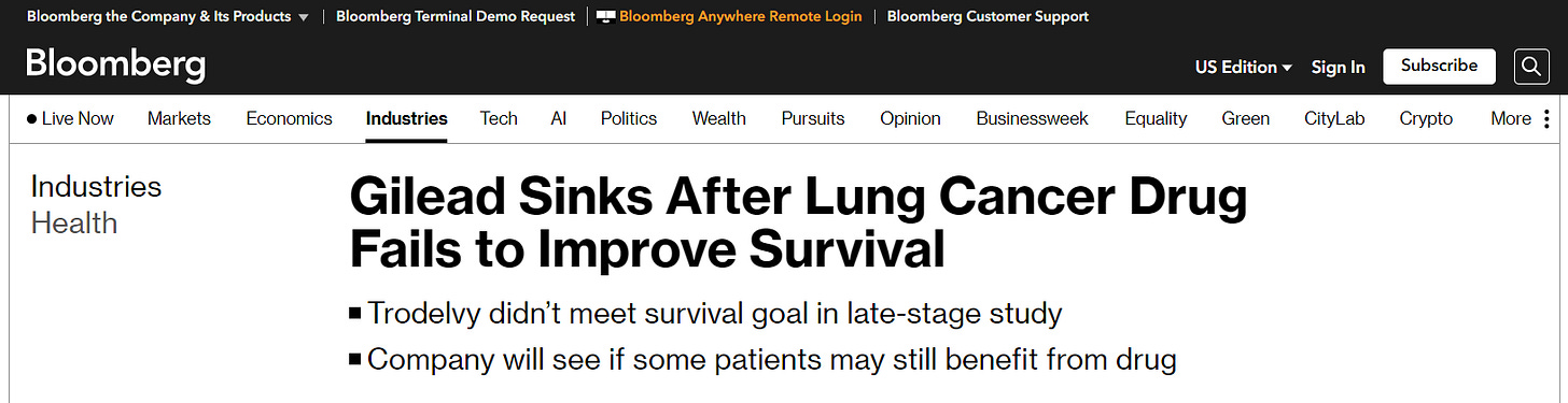 Cổ phiếu của Gilead giảm sau khi Trodelvy - thuốc điều trị ung thư phổi, không cải thiện khả năng sống sót trong cuộc thử nghiệm trên bệnh nhân ung thư phổi giai đoạn cuối