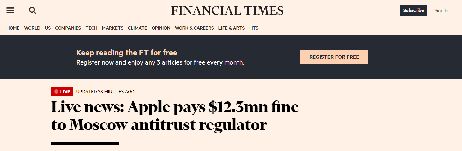 Apple nộp phạt 12,3 triệu USD cho cơ quan quản lý chống độc quyền ở Moscow: sau khi tòa án ở Moscow phát hiện gã khổng lồ công nghệ Mỹ lạm dụng vị trí thống lĩnh thị trường trên App Store