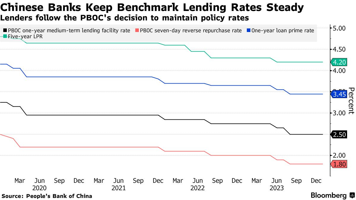 Các ngân hàng thương mại của Trung Quốc đã giữ nguyên lãi suất cho vay, phù hợp với quyết định duy trì lãi suất của PBOC trong bối cảnh lo ngại về áp lực lên đồng nhân dân tệ