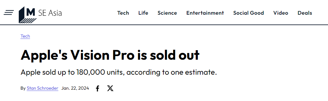 Mặt khác, Apple vừa bán hết ~80,000 chiếc Vision Pro trong giờ preorder đầu tiên. Apple dự kiến sẽ bán được khoảng 300,000 - 400,000 chiếc Vision Pro vào năm 2024