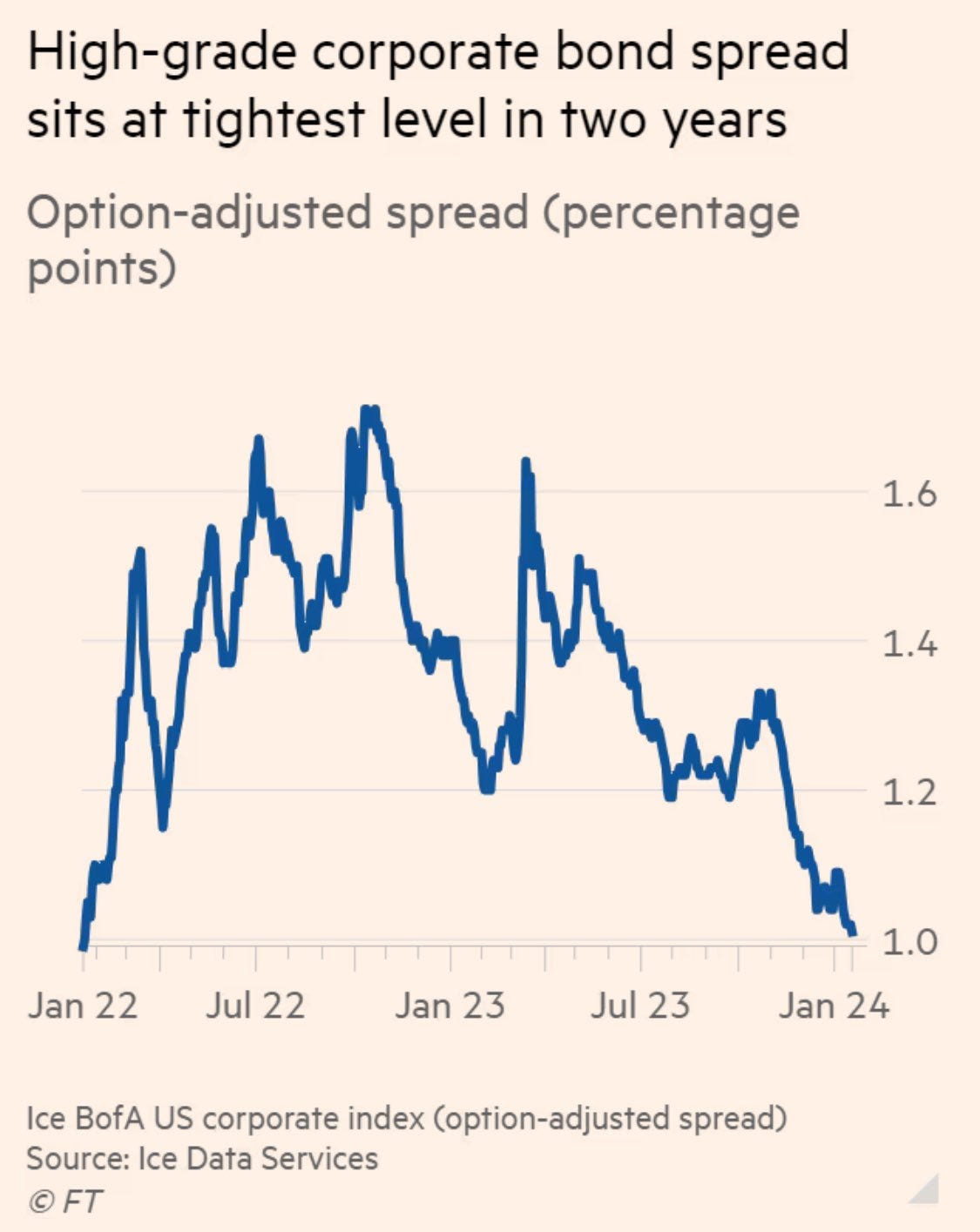 Chênh lệch lợi suất giữa trái phiếu hạng cao và trái phiếu Kho Bạc Mỹ giảm xuống mức thấp nhất trong 2 năm.