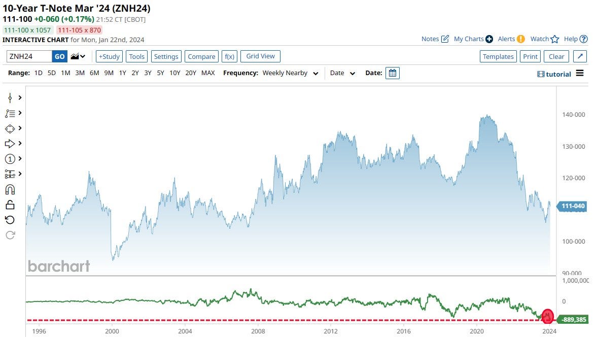 Ở thị trường trái phiếu công: các quỹ phòng hộ hiện đang bán hơn 889,000 hợp đồng trái phiếu kho bạc 10 năm — lượng vị thế short cao nhất trong lịch sử.