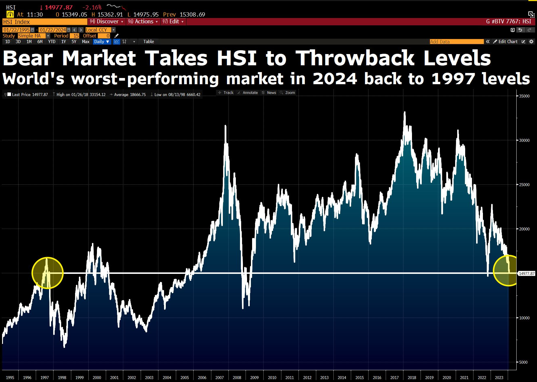 Chỉ số HSI giảm xuống dưới 15,000 — tương đương với mức thường được nhìn thấy năm 1997