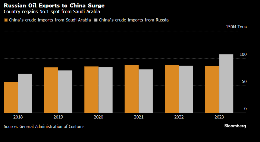 Nga đã vượt qua Ả Rập Saudi để trở thành nhà cung cấp dầu lớn nhất của Trung Quốc lần đầu tiên kể từ năm 2018, cho thấy lệnh trừng phạt của Mỹ đối với Nga kém hiệu quả như thế nào.