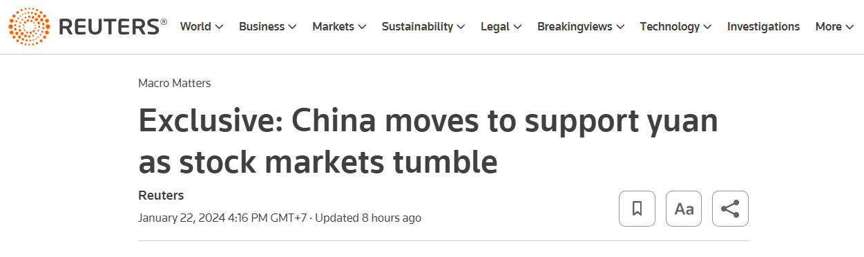 Các ngân hàng quốc doanh lớn tại Trung Quốc đã bán USD trên thị trường nội địa để nỗ lực hỗ trợ giá đồng CNY, trong bối cảnh chứng khoán trong nước sụt giảm mạnh vào sáng nay sau khi PBoC quyết định giữ nguyên lãi suất LPR.