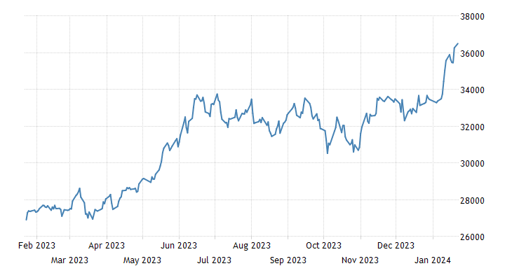 Chỉ số Nikkei 225 tăng 1.4% lên trên 36,400 trong khi chỉ số Topix tăng 1% lên 2,535 nhờ đà tăng của cổ phiếu công nghệ